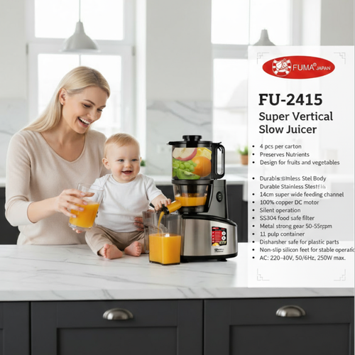 آبمیوهگیری فوما مدل FU-2415 با طراحی عمودی و عملکرد آهسته، گزینهای حرفهای برای تهیه آبمیوههای مغذی و اسموتیهای سالم است. موتور DC با سیمپیچ 100٪ مس، عملکردی قدرتمند و بیصدا را فراهم میکند.